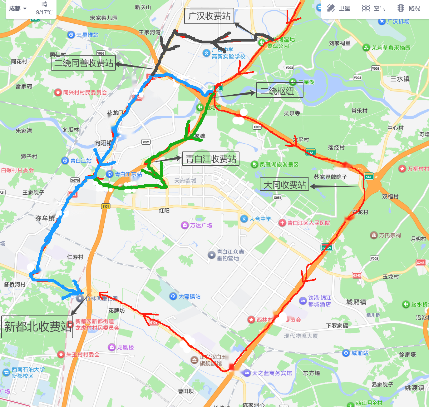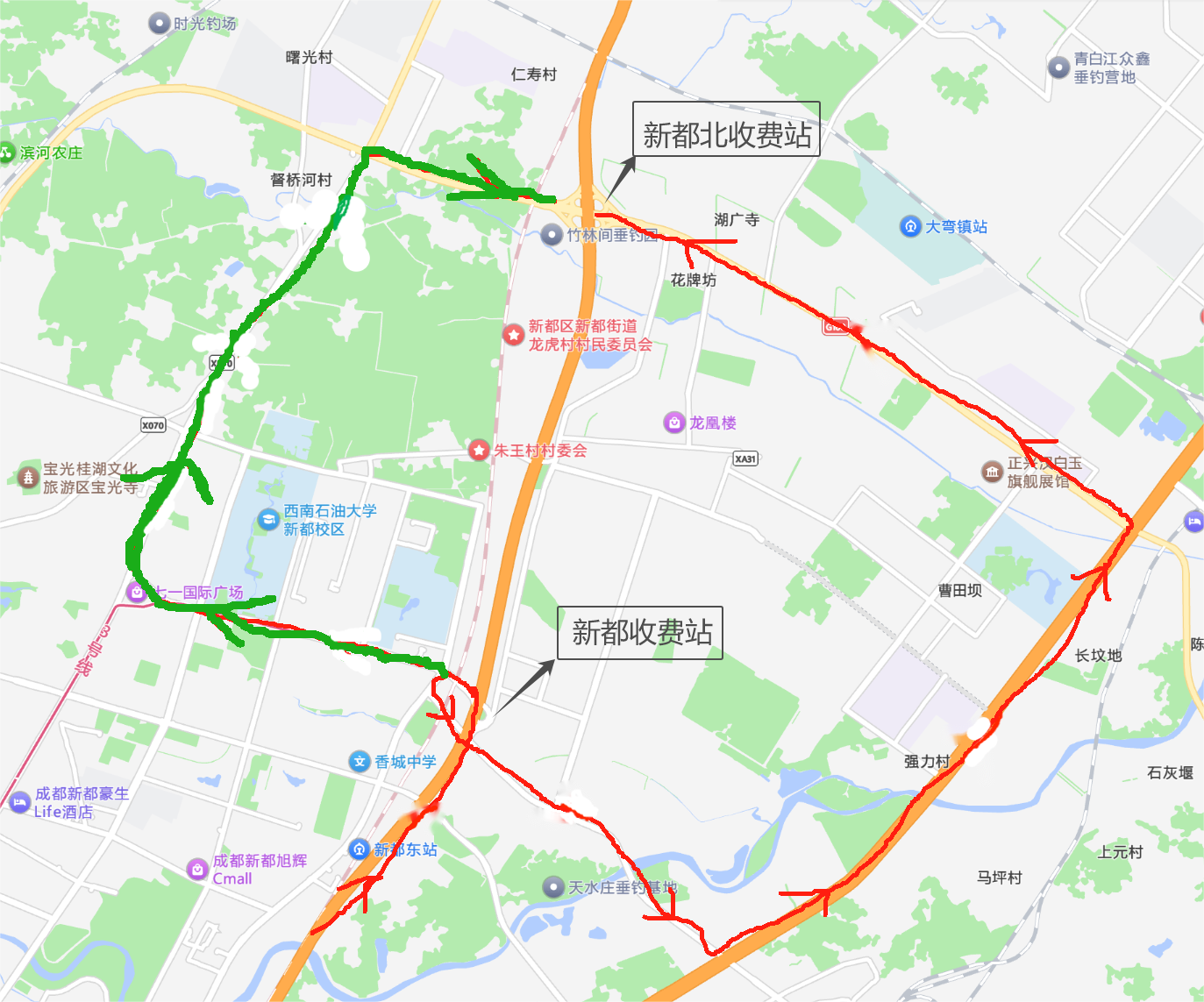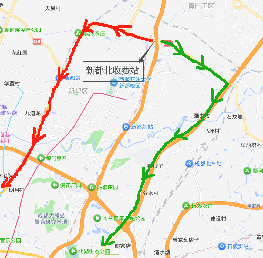 1、原需经新都北收费站进站前往成都方向车辆:经G108国道、成金青快速通道等路线绕行数魅优配。示意图如下:
