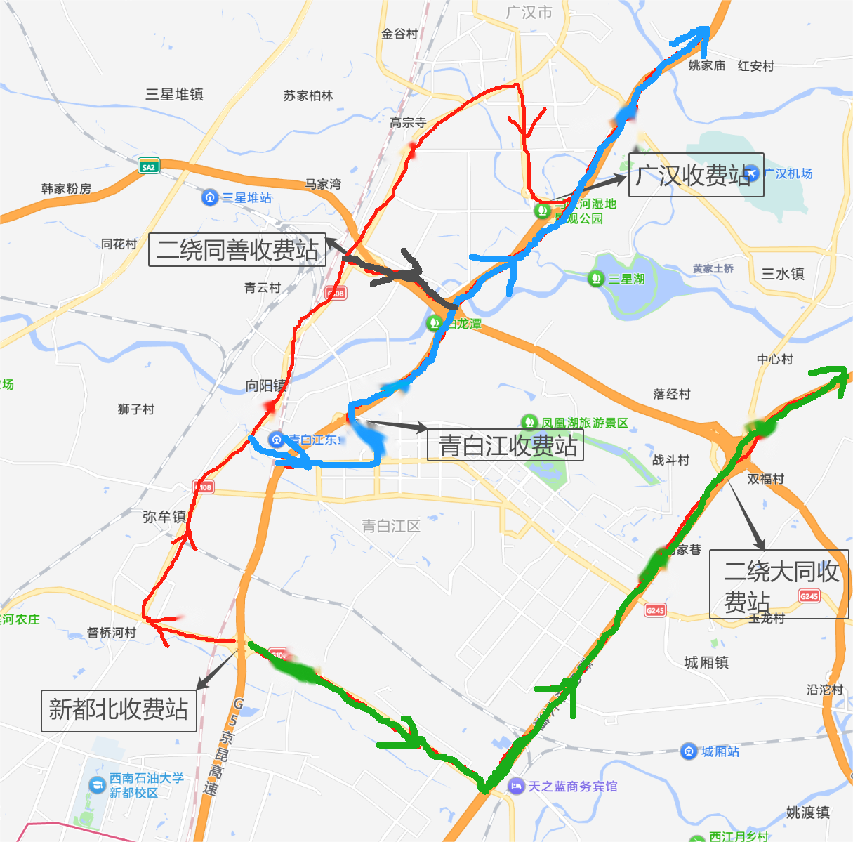 3、成都往绵阳方向原需经新都北收费站出站车辆:需提前从新都收费站下站经G108国道、成金青快速通道等路线绕行。示意图如下: